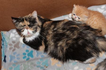 Winifred's litter of Exotic Shorthair and Longhair kittens were born on August 24, 2025. She has two Shorthair kittens and one Longhair kitten. The black & white shorthair male is available and so is the red longhaired female. We try to post new pictures on Sundays or Mondays. Please check back weekly to watch them grow. This is Winifred's last litter. She will be available for adoption once her kittens are 12 weeks old.
