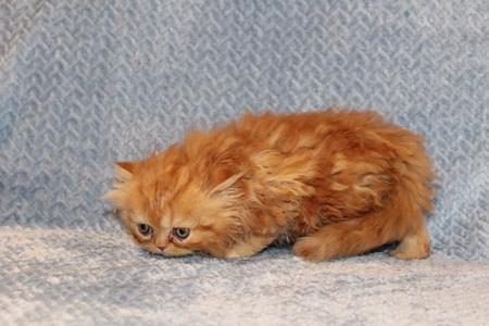 No. 313. 5 week old Red Exotic Longhair female. This lil girl is in her awkward phase. She is going to be stunning as she grows. Her fur is thick and so long. Going to be a very fluffy girl. Just like her sister, she has a lot of gold highlights that the camera does not pick up. $1600. Available